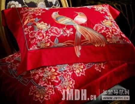 喜鹊在中国传统文化中有吉祥和爱情的象征,与郁金香、玫瑰、金银花相融合,花团锦簇,繁华似锦,寓意新人婚后生活前程似锦、兴旺发达的欣欣向荣景象;只为见证“愿得一人心,白首不相离”的忠贞爱情;中式庭院中的两个案板元素象征“举案齐眉”;桂圆红枣莲子花生在被角处的精致绣花,增添特有的喜气,传统的风雅绽放出别样的韵致,为中式婚房增添别样热闹的喜气氛围。