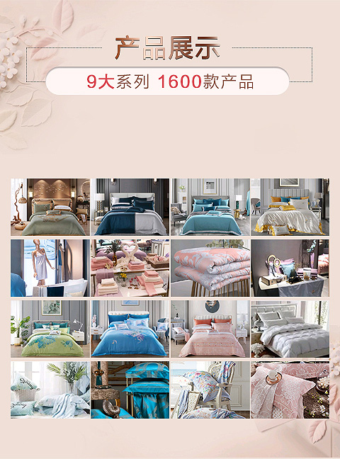 拥有礼盒套件、被子、枕芯、盖毯、床垫、毛浴巾、居家服饰、夏令用品、酒店用品等九大系列。其中两丝(天丝、真丝)两绒(磨绒、羽绒)产品作为凯盛核心产品颇受消费者青睐。