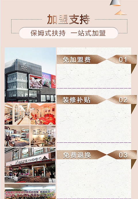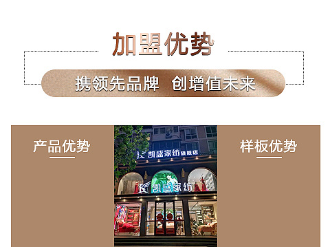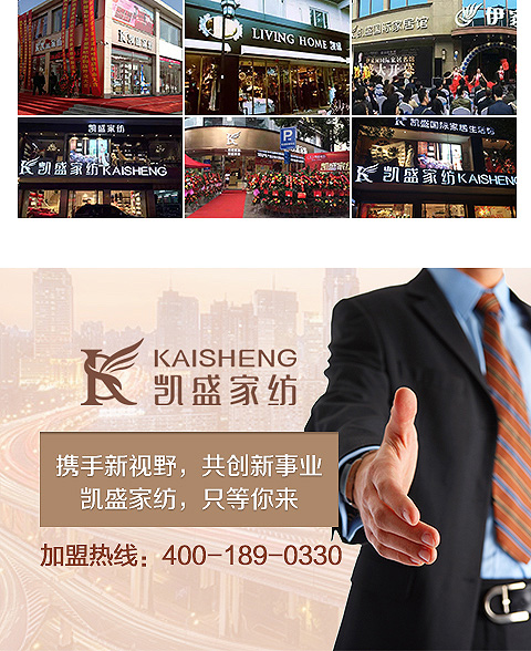 现在加盟凯盛家纺享9大优惠加盟支持!免费获取详细加盟优惠政策、加盟条件、产品图册、投资详情资料,敬请留言或电话垂询。